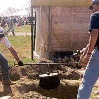 The preparation of bean hole beans, a traditional foodway that Maine lumberjacks borrowed and adapted from Native American practices, was preserved by the Maine Folklife Center at the Common Ground Country Fair in Unity, Maine. A cast-iron pot of beans is buried with hot coals for 16 hours in a rock-lined pit that is three feet deep. Traditionally, heirloom colonial varieties of beans are used such as Yellow Eye, Jacob's Cattle, and Soldier. A videotape of the bean hole bean demonstration was made at the September 1999 fair.